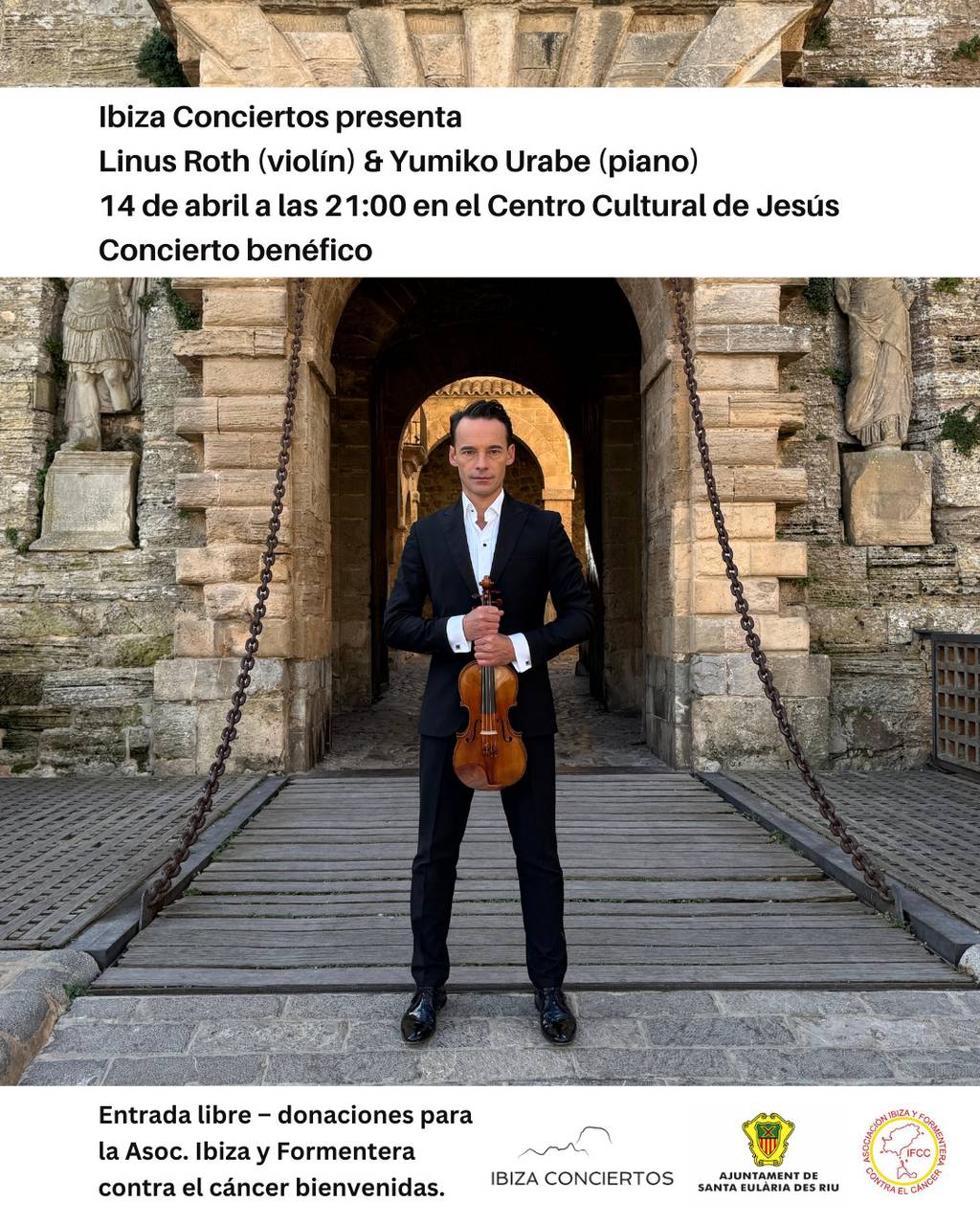 Ibiza Conciertos ofrece un concierto solidario a cargo del renombrado violinista y director artístico de Ibiza Conciertos, Linus Roth, y la pianista japonesa Yumiko Urabe este martes 14 de abril, a las 21:00 horas, en el Centro Cultural de Jesús para apoyar la labor de la Asociación Ibiza y Formentera Contra el Cáncer, IFCC. Una velada musical que servirá para recaudar fondos y colaborar con los pacientes oncológicos de las Pitiusas, que cuenta con entrada gratuita y en la que se aceptarán donaciones destinadas a IFCC por un importe mínimo de diez euros, que se podrán realizar en la entrada del auditorio.
