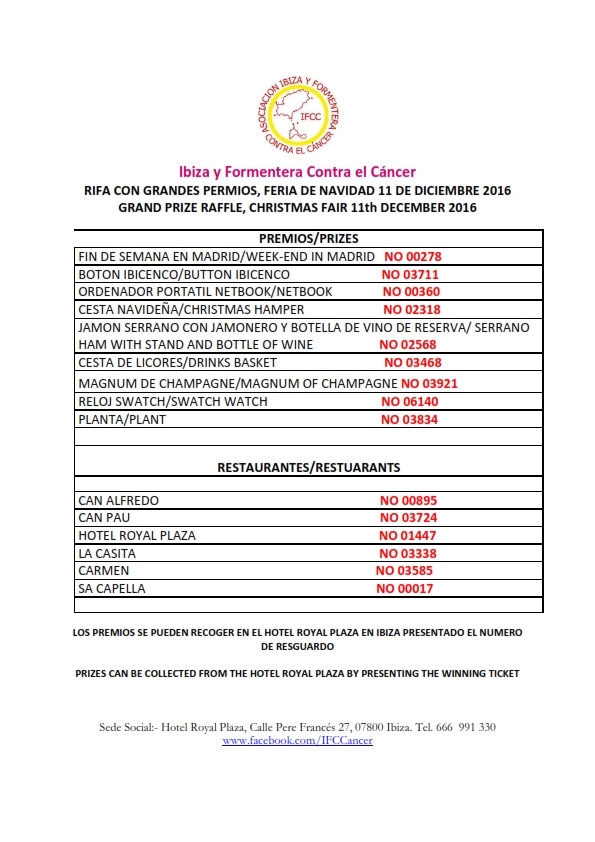 Sin categorizar ¡Felicidades a todos los ganadores! Updated on 14/06/2024 by IFCC No hay comentarios en ¡Felicidades a todos los ganadores! Los premios se pueden recoger en el Hotel Royal Plaza en Ibiza, presentando el número del resguardo