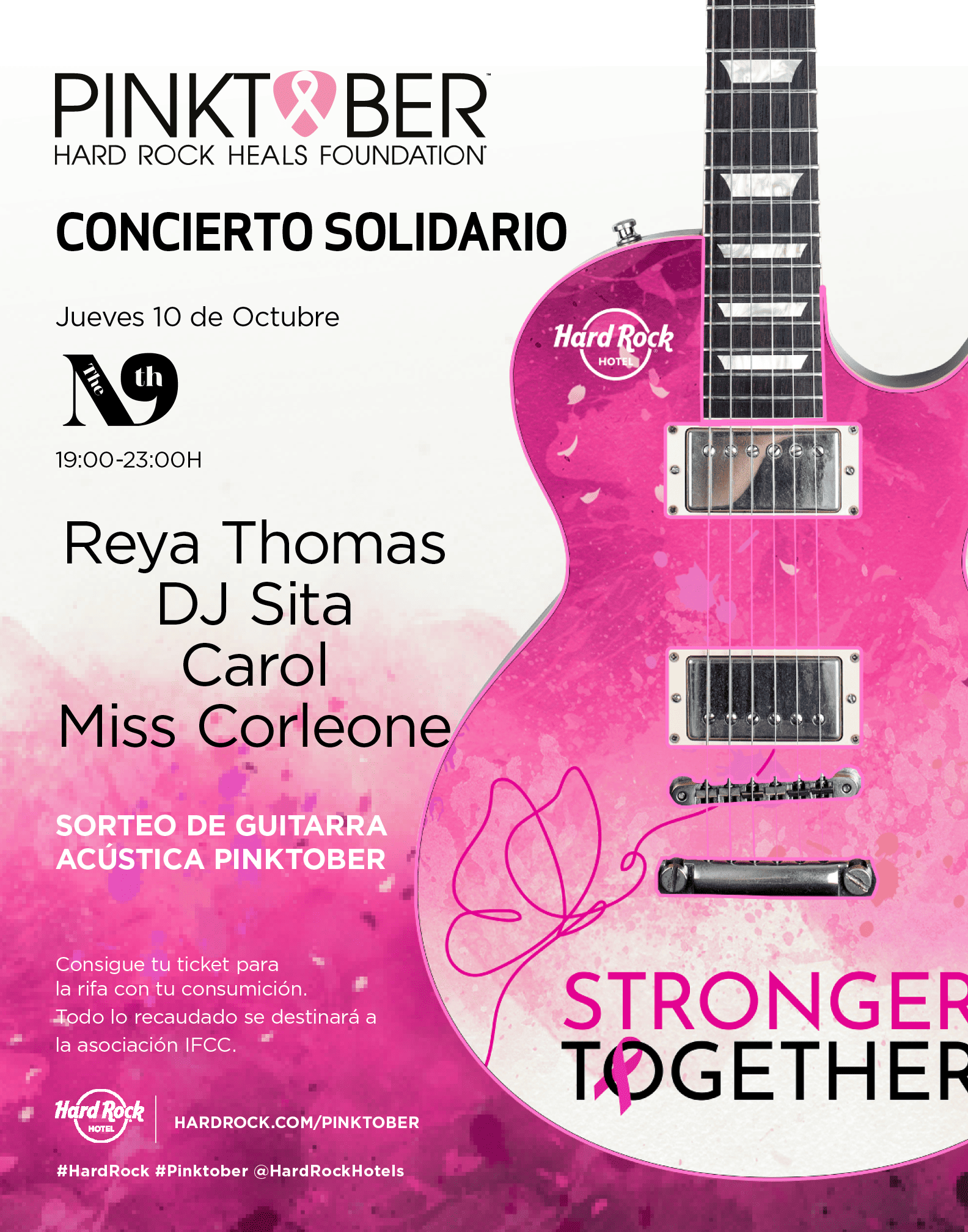 Hard Rock Hotel Ibiza iniciará su mes solidario por todo lo alto con un concierto gratuito el próximo jueves 10 de octubre, desde las 19:00 horas, de la mano de reconocidos artistas como Reya Thomas, Carol, Miss Corleone o DJ Sita, quienes pondrán la banda sonora a este evento benéfico en el que se llevará a cabo el sorteo de una guitarra rosa acústica. Los asistentes podrán participar en esta rifa obteniendo un ticket con cada consumición. Toda la recaudación de este evento se destinará a la asociación Ibiza y Formentera Contra el Cáncer, IFCC.